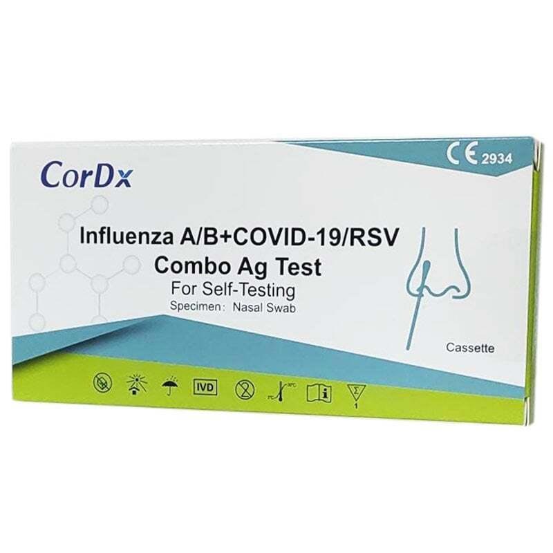 Το CorDx Τριπλό Τεστ, Rapid Test Quad A/B + Covid-19/SRV Combo Ag Test είναι ένα τεστ που προορίζεται για την ποιοτική ανίχνευση των αντιγόνων των ιών SARS-CoV-2 , της γρίπης Α και Β καθώς και του αναπνευστικού συγκυτιακού ιού (RSV) που είναι ένας εξαιρετικά μεταδοτικός ιός του ανωτέρου αναπνευστικού που μολύνει κυρίως παιδιά.